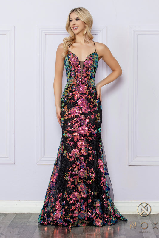 Floral Sequin Prom Dress with Strappy Back_NX R1439